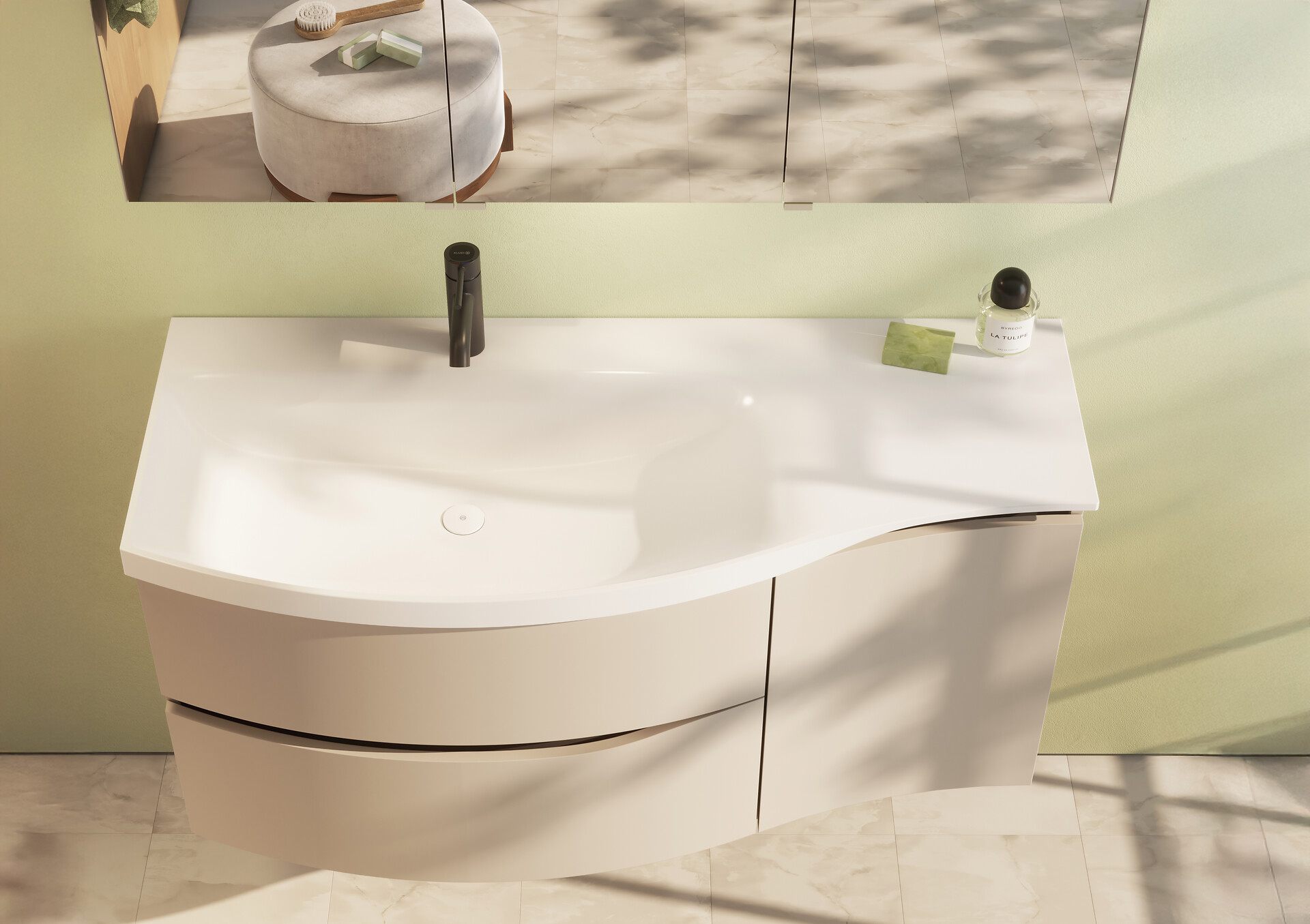 Wie ein Flügel schwebt der filigrane Mineralguss-Waschtisch über dem Korpus. Aus dem Rückschwung der sich auch nach oben verjüngenden Waschtischkante ergibt sich die seitliche Griffmulde. Optisch setzt sich damit der Schwungansatz der unteren Griffmulde fort, über die sich die beiden tiefen Auszüge öffnen lassen.